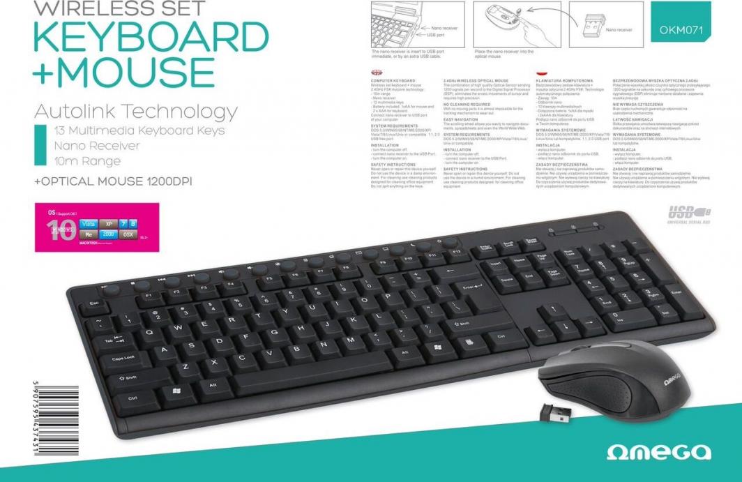 Kompleti OKM071B përbëhet nga një tastierë me valë me një tastierë të ulët dhe një maus optik me valë 1000 DPI. Kompleti është i pajisur me një marrës nano USB, i cili lidhet si me miun ashtu edhe me tastierën. Teknologjia e lidhjes automatike ju lejon të lidhni lehtësisht dhe shpejt kufjet me kompjuterin tuaj. Mausi është i pajisur me një sensor optik të cilësisë së lartë me një rezolucion prej 1000 DPI, një rrotull të gjerë gome dhe një shtresë të rehatshme.