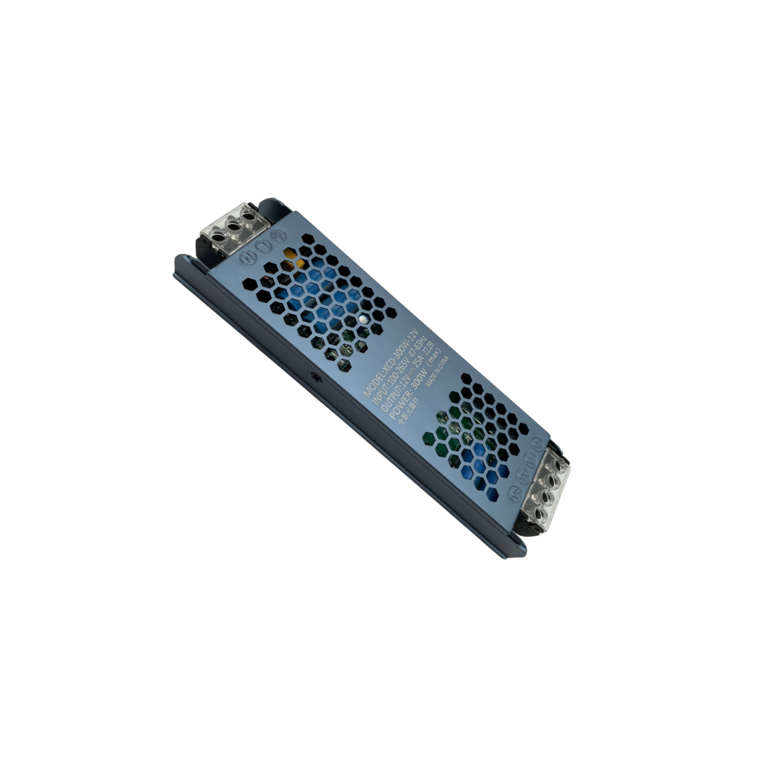 Transformator LED me dalje 12 V DC dhe rrymë maksimale 25 A, me fuqi 300 W. I destinuar për përdorim të brendshëm, me mbrojtje IP20 dhe efikasitet rreth 70–80%. Përdoret zakonisht për shirita LED, kamera sigurie dhe sisteme ndriçimi me ngarkesë më të lartë.