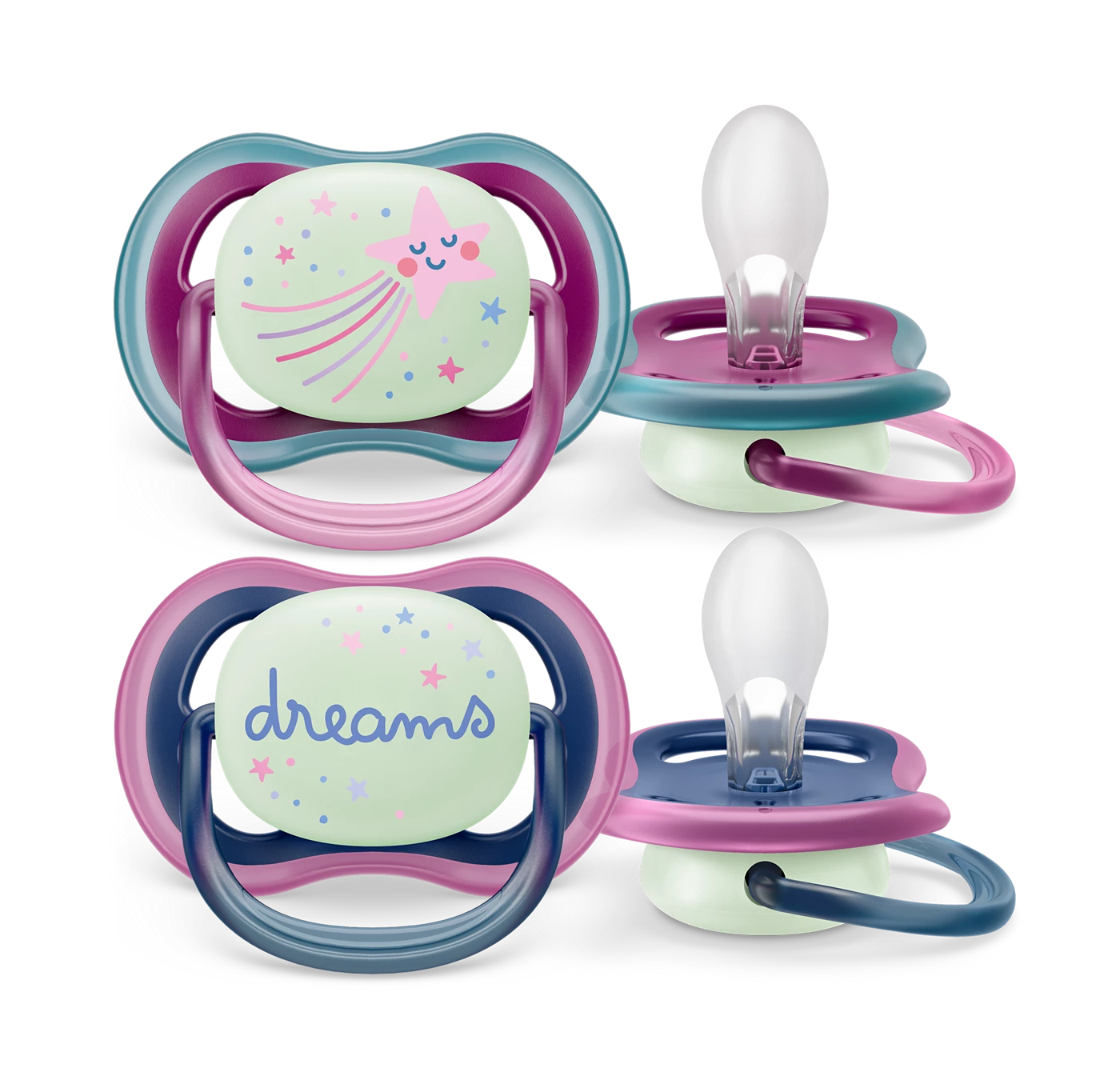Kjo memë është ndër më të lehtë, me një mburojë të hollë dhe vrima të mëdha që nxisin qarkullim optimal të ajrit—ndihmon që lëkura e ndjeshme të qëndrojë e thatë dhe rehatshme. Ka një buton që ndriçon në terr—më lehtë ta gjesh gjatë natës pa ndezur dritën. Teatina prej silikoni është e butë, pa BPA dhe ka formë ortodontike e simetrike, duke mbështetur zhvillimin natyral të gojës dhe dhëmbëve. Për një pastrim të shpejtë dhe të thjeshtë, vjen me një kuti që shërben edhe si sterilizues—mjafton të shtosh ujë dhe ta ngrohësh në mikrovalë për disa minuta. Një zgjedhje e menduar mirë, komode dhe higjenike për foshnjat dhe prindërit që kërkojnë të lehtësojnë netët dhe të ruajnë pastërtinë e përditshme.