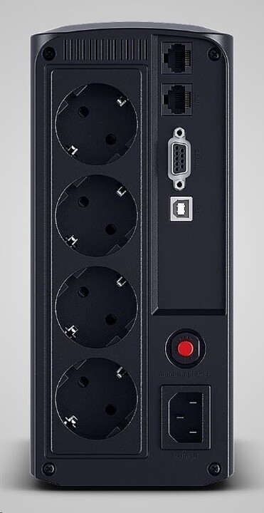 Fuqia 1000 VA / 550 W. Mbrojtja e telefonit / rrjetit RJ11 / RJ45 (e kombinuar), hyrja / dalja 1/1. Ndërfaqja e energjisë: hyrja: IEC C14; priza: 4 x Schuko (e mbështetur dhe me mbrojtje nga mbitensioni).